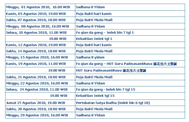 Jadwal Kegiatan Vihara Bulan Agustus 2010